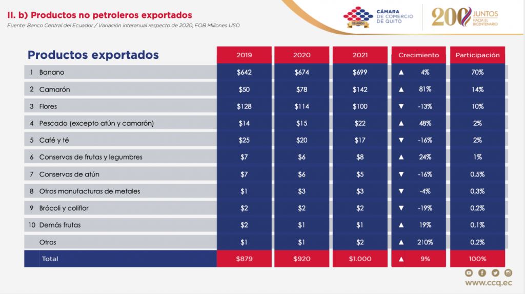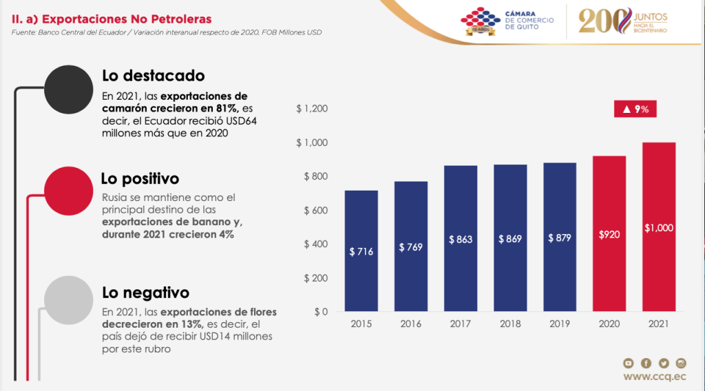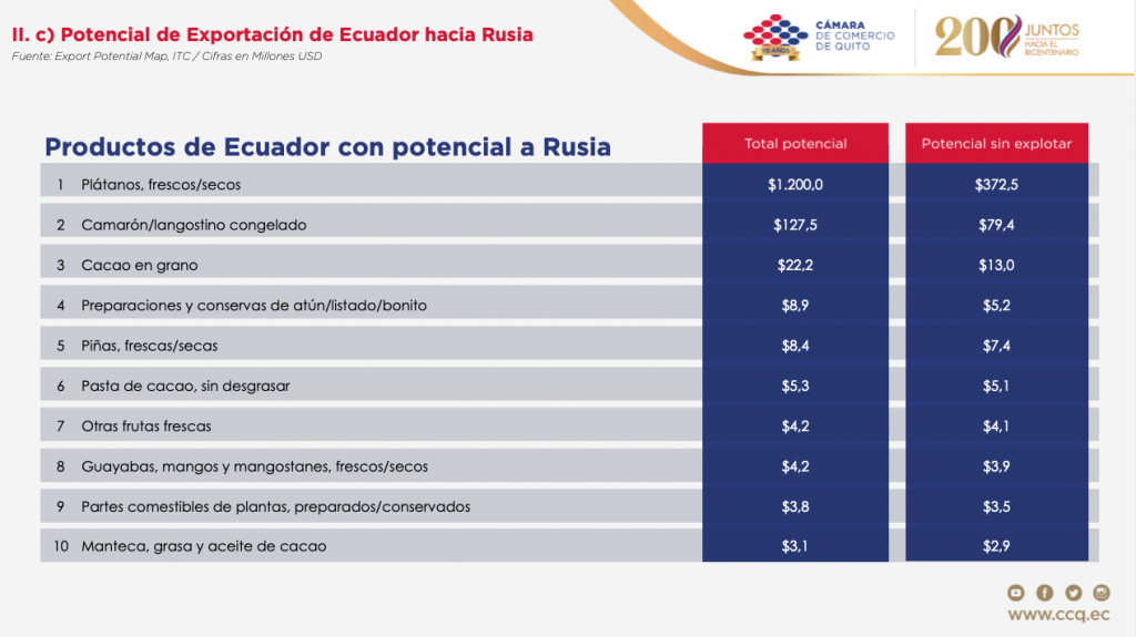 En este contexto se presentó el reporte comercial Ecuador – Rusia 2021, en el cual se detalla que Rusia es el tercer país destino de las exportaciones no petroleras del Ecuador con un monto que llegó a los USD 1000 millones para 2021.