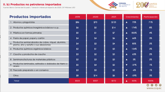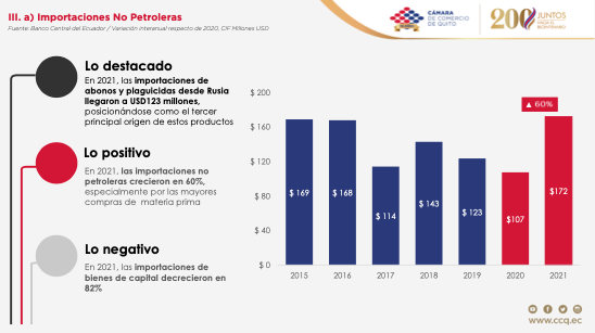 Desde Rusia se importan principalmente abonos, plaguicidas, insumos químicos y plásticos en formas primarias. Es el tercer país al que Ecuador le compra abonos y plaguicidas, pero estas importaciones podrían reemplazarse con las de China, Colombia y EEUU.