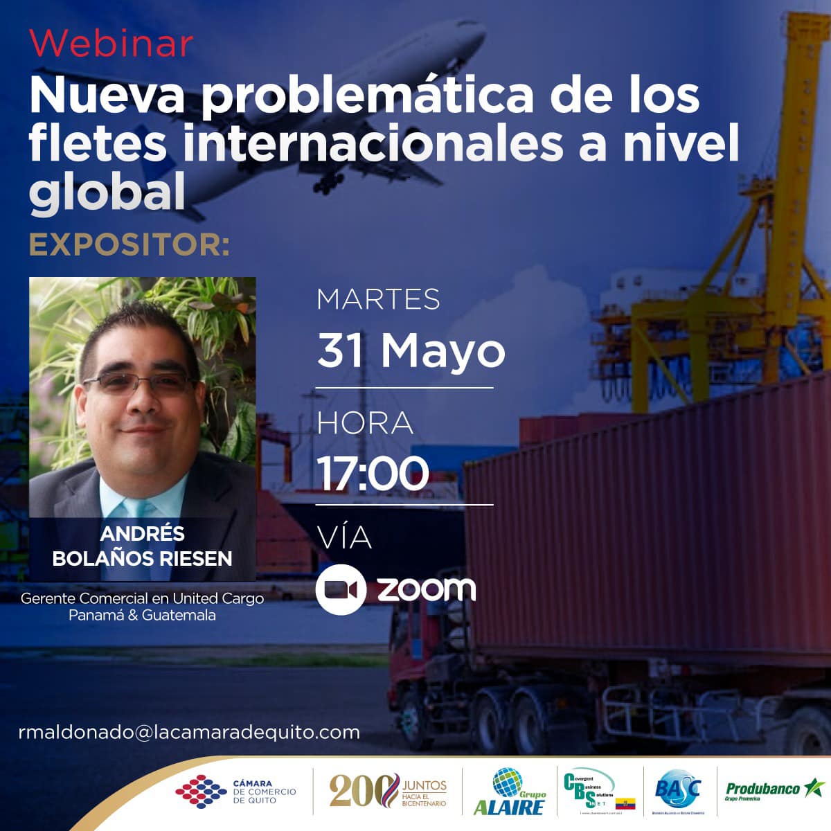 El pasado 31 de mayo se desarrolló el webinar “Nueva problemática con los fletes internacionales a nivel global” organizado por Grupo Alaire. En este evento, se dio a conocer de manera general el panorama de los fletes y el comercio internacional en la actualidad, a través de la experiencia de nuestro especialista panameño Andres Bolaños.