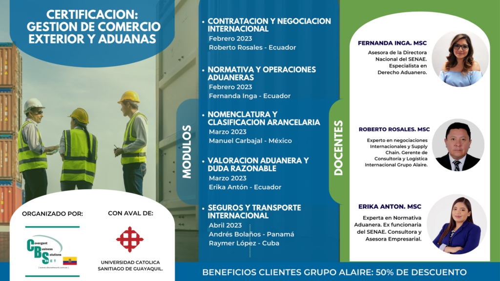Gracias al esfuerzo conjunto de CBS Network Ecuador y Grupo Alaire, en Febrero 2023 se llevará a cabo el Programa de Certificación en Comercio Exterior y Aduanas, con el objetivo de fortalecer competencias técnicas en nuestros clientes. El programa cuenta con el aval académico de la Universidad Católica Santiago de Guayaquil lo que garantiza al …