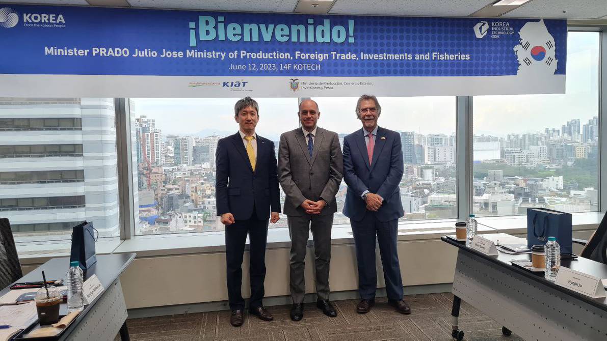 El Ministro de Producción, Comercio Exterior, Inversiones y Pesca de Ecuador, Julio José Prado, se reunió en Seúl con Cheon Kyo Park, director de Cooperación Internacional del Instituto del Ministerio de Comercio, Industria y Energía de Corea (KIAT), para discutir la creación de un Centro de Desarrollo Tecnológico para alimentos y bebidas denominado Food Task Center. Esta reunión se llevó a cabo como parte de los esfuerzos del Ministerio para fortalecer los lazos comerciales entre ambos países.