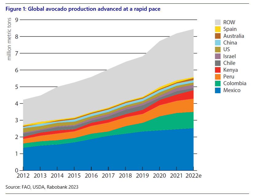 La producción mundial de aguacate está en aumento, lo que proporciona a los consumidores oferta durante todo el año. Durante la última década, la producción global de aguacate ha aumentado alrededor de un 7%. Cindy van Rijswick, estratega global de productos hortofrutícolas e insumos agrícolas de Rabobank, destaca que los precios atractivos y los buenos rendimientos fueron factores clave para la expansión de la producción en regiones clave. En México, que actualmente representa el 30% de la producción mundial de aguacate, la producción creció cerca de un 6% durante la última década. Colombia, Perú y Kenia también experimentaron aumentos significativos del 15%, 12% y 11% respectivamente, representando el 12%, 9% y 6% de la producción mundial actual. Por otro lado, Estados Unidos, que solía estar entre los principales países productores de aguacate en 2012, ha descendido en la clasificación y ya no figura entre los 10 principales.