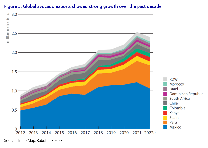 Las exportaciones de Perú, España y Kenia han aumentado aproximadamente un 22%, 6% y 15% respectivamente entre 2012 y 2022, abasteciendo principalmente a Europa. Durante ese mismo periodo, las importaciones también han aumentado en los Países Bajos (14%), España (20%), Francia (8%), Alemania (1%) y el Reino Unido (12%). Chile ha experimentado el mayor incremento en las importaciones entre los 10 principales países importadores de aguacate.