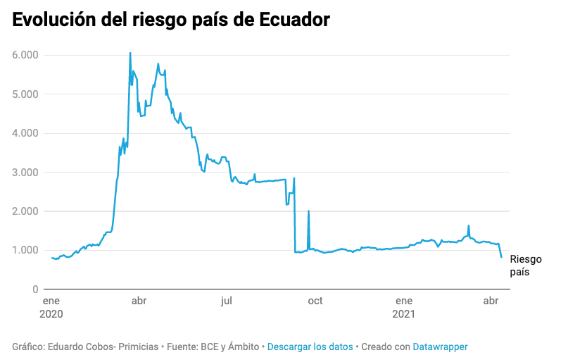 Entre el viernes 9 y el lunes 12 de abril de 2021, el riesgo país de Ecuador cayó 345 puntos.