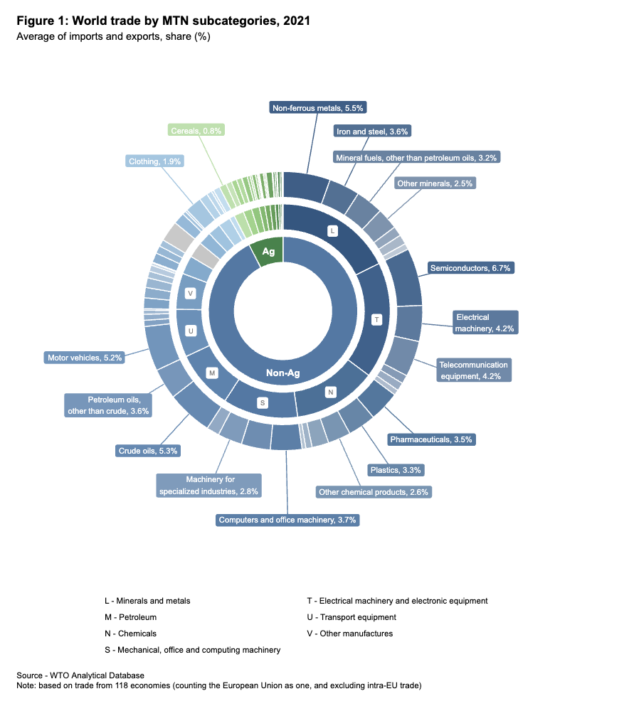 El gráfico 1 muestra la participación en el comercio mundial en 2021 en valores desglosados según las nuevas categorías de las NCM. El anillo interior compara la participación de los productos agropecuarios y no agropecuarios, lo que pone de manifiesto que los productos no agropecuarios/industriales representaron el 92,5% del comercio mundial.