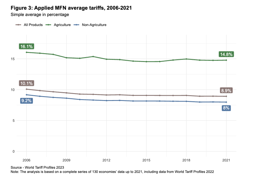 Si bien es cierto que entre 2007 y 2021 se consiguieron algunos avances en la reducción de los aranceles, en general esas reducciones han sido muy modestas. En el gráfico 3 se observa una reducción de solo 1,2 puntos porcentuales en los derechos NMF totales, efectivamente aplicados desde 2006, mientras que los aranceles promedios para los productos agropecuarios e industriales fueron del 14,8% y 8%, respectivamente, en 2021.
